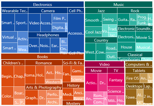 ツリーマップを作成するには、wijmo.chart.hierarchical.TreeMapコントロールを使用します。このトピックでは、ツリーマップに固有の機能について説明します。データラベル、エクスポート、パレット、スタイル設定などの共通の機能については、チャートモジュール内の他のトピックを参照してください。