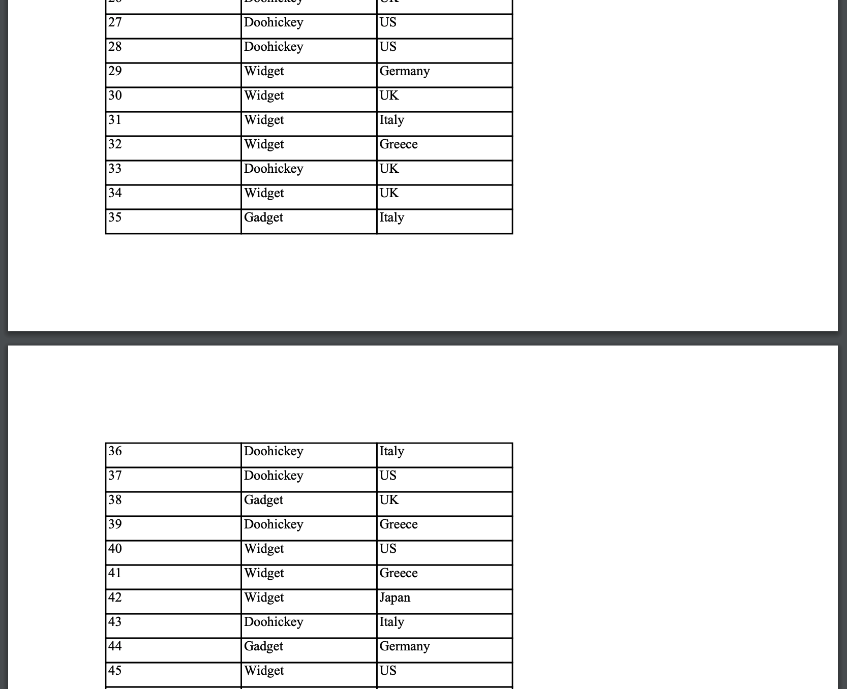 このコード例では、50行3列のテーブルを作成します。また、セルの作成時にデータコレクション内のテキストをテーブルのセルに描画します。ページのオーバーフローも考慮します。